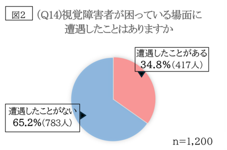 「視覚障害者が困っている場面に遭遇したことはありますか(Q14)」という質問では、「遭遇したことがある」と回答した人は34.8%でした(図2)。具体的な困っている場面としては、「青信号になっても、動き始めるのに困っている様子だった」「点字ブロックに物が置かれていた」「バスに乗る際に、行き先案内のアナウンスがないため、どのバスに乗れば良いのか分からず困惑していた」などの回答がありました。