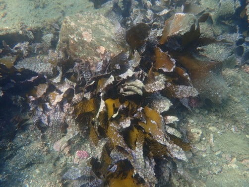 千葉県内房地域ではアラメを対象とし、水深約3mの岩盤に対してセルロースポリマー溶液にアラメ遊走子を混合させ散布を実施いたしました。2024年10月に散布を行い、2025年8月に追跡調査を行ったところ、1平方メートルあたりのアラメ密度は、無散布地点に比べ散布地点では1.78-6.4倍と高い数値が得られました。同地点は周囲にアラメが確認されていることから、天然由来の加入に加え本手法による散布の効果があったものと考えられます。