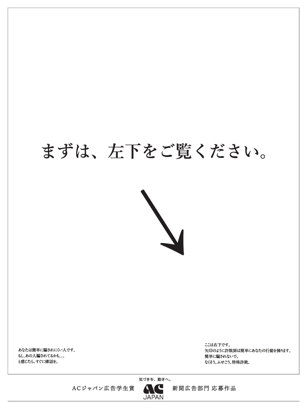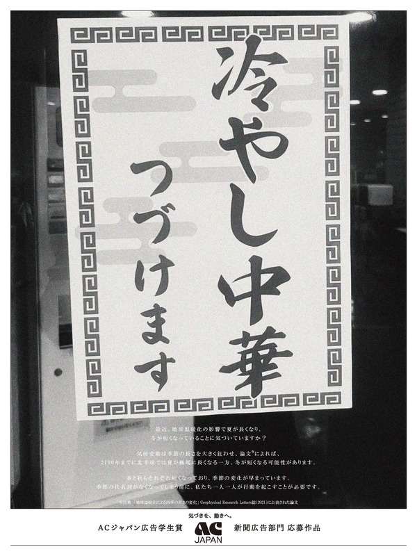 また「新聞広告部門」では、「特殊詐欺」をテーマにした『矢印の詐欺師』(東北芸術工科大学、制作者:須藤 丈翔さん)がグランプリを、「地球温暖化」をテーマにした『冷やし中華、つづけます』(岡山県立大学、制作者:平田 理華さん)が準グランプリを受賞しました。