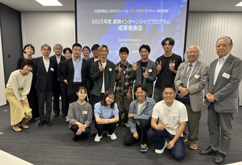公益財団法人日本グローバル・インフラストラクチャー研究財団(所在地:東京都港区、理事長:中山幹康、略称:日本GIF)は、2025年8月から10月にかけ、全国の大学の学部生を対象に、調査研究体験を通じてグローバル・インフラへの関心を喚起することを目的とした、夏期インターンシッププログラムを、都内の会場およびオンラインにて実施しました。今年度のテーマは、1960年に出版された『21世紀への階段』に記載された、グローバル・インフラに関する未来予測の検証としました。本プログラムは、今年で5回目の開催であり、調査研究を体験する他に類似のない独自性の高いプログラムです。首都圏外の学生には旅費を支給し、対面ミーティングとオンラインミーティングを組み合わせることで、多様な学生がインターンシップに参加できるよう企画しています。