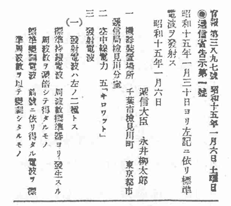 昭和の初め、無線通信技術の発達に伴い電波の利用範囲が広がる一方で、各無線局が発射する電波の周波数が公称の周波数からずれていることによる混信が多くなりました。その解決に向けて、各無線局が発射する周波数を公称のものに正確に合わせることが必要になり、その基準とする周波数の電波すなわち標準電波を発射する標準電波局が必要とされました。このため、NICTの当時の前身組織である逓信省電気試験所は1940年1月に、周波数4 MHz他の短波の標準電波局(コールサインJJY)として、千葉県に検見川送信所を開設しました(図1参照)。米国の標準電波局(コールサインWWV)の送信所に続いて世界で2番目の開設でした。その後、終戦による一時的な中断を経て、1948年8月には標準電波に秒信号を追加することによって時刻通報を開始しました。