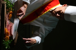 (写真は、アートホテル小倉ニュータガワ総料理長 戸川 健による「国産黒毛和牛ロース肉」のカッティングサービスの様子)
