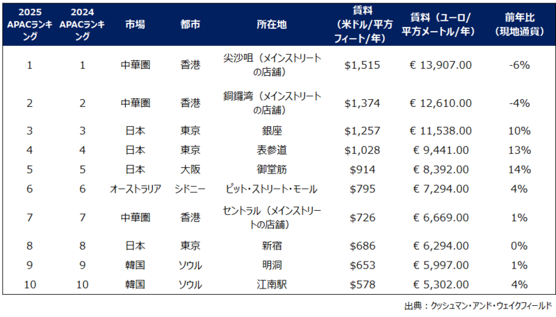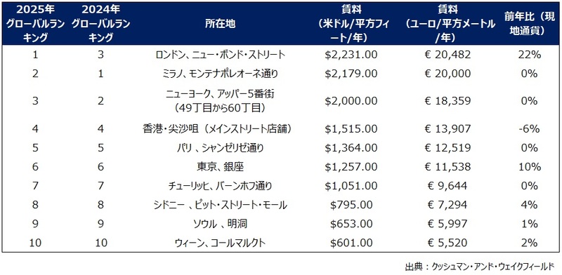 世界のメインストリート2025 リサーチ結果 - 銀座と表参道は、賃料上昇率10%、13%と堅調な伸びを記録