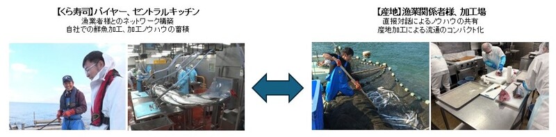 鮮魚の処理や熟成加工における最適な品質管理を、チルド・冷凍を問わず、自社のセントラルキッチンで研究、実践し、そのノウハウや各産地で得た知識を各産地加工場へフィードバック。産地加工により物流のコンパクト化を図り、全国チェーン店でありながら、輸送コストの低減や店舗での提供を容易に。