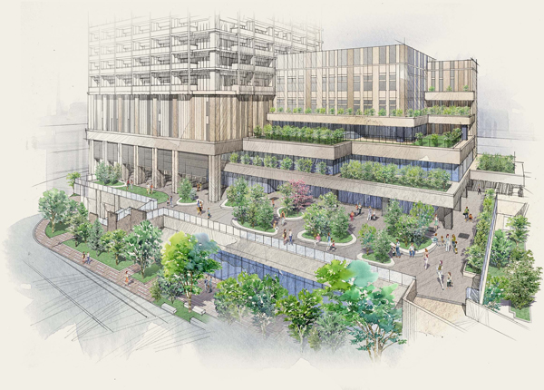 1階~3階には商業施設、4階~6階には事務所の他、2階には船橋エリア周辺の植生に配慮した緑豊かな植栽を配した広場「フォレストアリーナ」を設け、森を彷彿とさせる駅前空間を創出します。