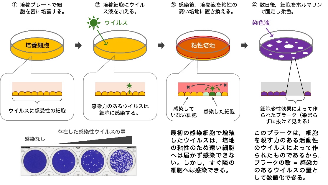 プラークアッセイ法:感染力をもつウイルスの量を測定する生物学的方法である。ウイルスに感受性の細胞を培養用プレートに密に播種し、適度に希釈したウイルス液と培養すると、ウイルスの細胞変性効果によって感染した細胞、そしてその周辺の細胞が数日で死滅する。死滅した細胞の集団は、培養プレートから剥離するため、クリスタルバイオレットなどの染色液で細胞を染色すると、細胞変性効果によって細胞が剥離した領域は染まらず色が抜けたように見える。この色が抜けた部分を「プラーク」と呼ぶ。プラークは感染能力(感染性)のあるウイルスが作り出したものと考えられるため、培養プレートにどれだけの感染性ウイルスが加えられたのかを最終的に目視で知ることができる。