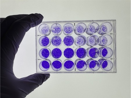 図2 24ウェル細胞培養プレートに作られたウイルスのプラーク. 紫色のウェルに