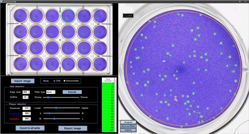 本研究では、細胞培養プレートに作られたウイルスのプラークを自動的にカウントするソフトウェア 「plaQuest」 を開発し (図3)、ウイルス阻害剤の評価試験における有用性を検証しました。