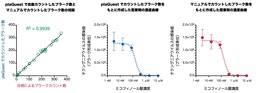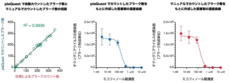 図4: チクングニアウイルスとその阻害剤を用いた plaQuest の実証実験.様々な濃度の阻害剤(ミコフェノール酸)で処理したチクングニアウイルスの感染価をプラークアッセイ法で測定する際に,得られたプラークをplaQuestで自動カウントした場合(縦軸)と,マニュアルでカウントした場合(横軸)のそれぞれの数をプロットすると高い相関が得られた(左グラフ)。
