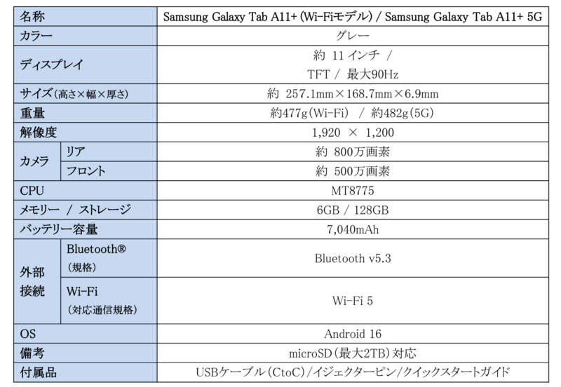 <主な仕様:「Samsung Galaxy Tab A11+ (Wi-Fiモデル)」、「Samsung Galaxy Tab A11+ 5G」>