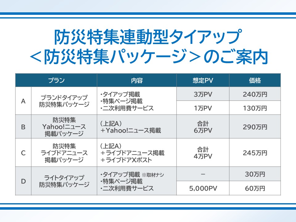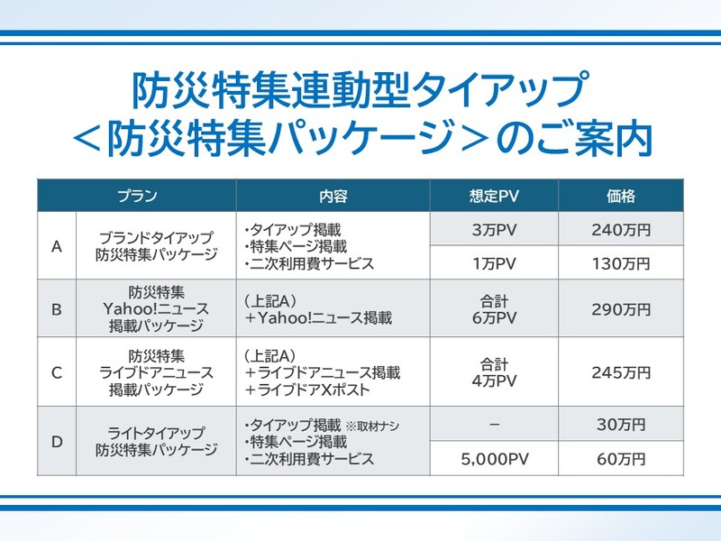 防災関連商材・サービスのブランディングに適した編集記事を制作し、Yahoo!ニュースなど外部メディアへ同時掲載可能なコラボパッケージも用意しています。