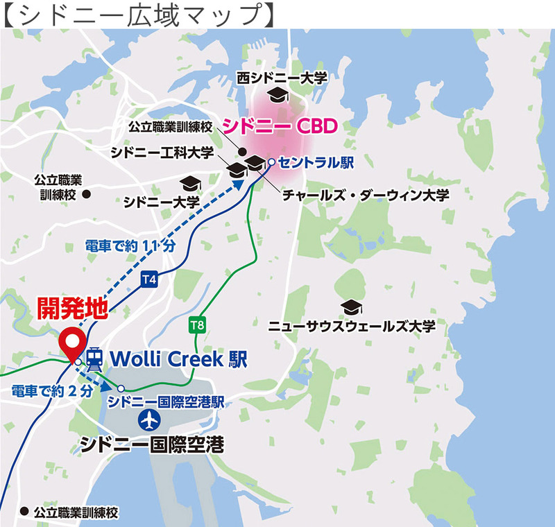 シドニーCBD(ビジネス中心地)の南西約8kmにあるWolli Creek(ウォーライ・クリーク)に位置します。物件はWolli Creek駅に直結し、電車でシドニー空港まで1駅(2分)、CBDまで3駅(11分)です。シドニーの主要幹線道路および高速道路入口までは車で約3~6分と、主要エリアへのアクセスが容易です。