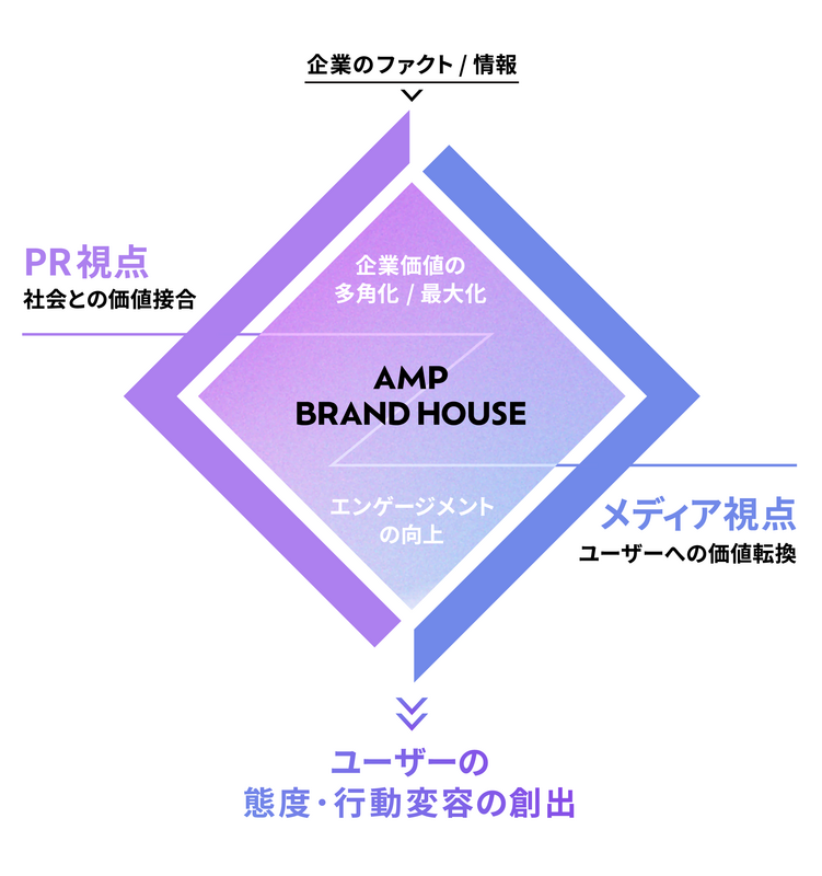 情報があふれる現代においては、企業の「事実」を届けるだけでは共感や行動を生むことが難しくなっています。そこでAMPは、PR観点の設計実行力と、メディア運営で培った編集ノウハウやユーザー理解を生かし、企業の持つ事実を“共感と行動を生むストーリーへと昇華”させ、企業価値の最大化を図ることを目的にブランドハウスを立ち上げました。PRが得意とする“社会的意義や物語の構造設計”と、メディアが得意とする“ユーザーに届く体験設計”を掛け合わせることで、企業の発信を社会的共感へと変換し、企業価値の最大化につながるユーザーエンゲージメントの向上を目指します。