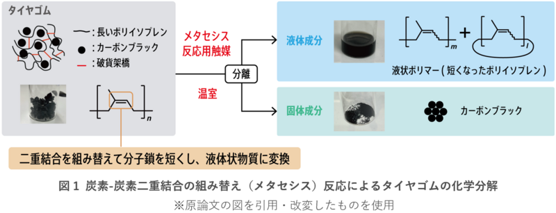 今回開発した技術では、炭素-炭素二重結合を組み替えるメタセシス反応をタイヤゴムの化学分解に利用しました。天然ゴムを含むポリイソプレンは、触媒的なメタセシス反応により化学分解可能なことは報告されていましたが、一般的な使用済タイヤに含まれている加硫ポリイソプレンゴムは、材料に含まれる硫黄成分がメタセシス反応による分解反応を阻害するため、化学分解は困難と予想されていました。この技術課題を解決するために、硫黄成分が共存しても活性を失わない特徴(分子構造)を有する錯体触媒の探索を行った結果、硫黄架橋や酸化防止剤存在下でも機能する高活性なメタセシス反応用触媒を見出しました。また、今回見出した反応条件では、短く分解されたポリイソプレンが、メタセシス反応によって再度長い鎖に戻る反応が抑えられることもわかりました。これにより、触媒と溶媒のみで、他に反応剤を添加しなくても、室温付近の温和な条件下で加硫ポリイソプレンゴムの分子鎖を短くし、液状のポリイソプレンを得ることに成功しました。原料の加硫ポリイソプレンゴムは溶媒に溶解しませんが、反応後の分子鎖の短いポリイソプレンは液状で溶媒にも溶解するため、溶媒に不溶な固体成分であるCBと容易に分離できます(図1)。このように本研究では、適切な触媒と反応条件を選択することで、実際のタイヤ製品に使用されているCB配合の加硫ポリイソプレンゴムを、メタセシス反応により化学分解が可能であることを初めて示すことができました。さらに本手法は、実験試料として当初用いていたモデルゴム材料に限らず、実際の使用済タイヤから回収したゴムの化学分解にも適用可能でした。