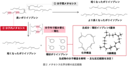 ポリイソプレン間で炭素-炭素二重結合が組み変わる分子間メタセシス反応が起きた場合には、分解で得られるポリイソプレン分子鎖は短いものから長いものまで混在するために、分子鎖の短いものだけを得ることはできません(図2-①)。このため、ポリイソプレンの分子鎖を短くするためには、これまでポリイソプレンと炭素-炭素二重結合をもつ低分子反応剤との分子間メタセシス反応による化学分解の研究がなされてきました。一方、ポリイソプレンの分子内メタセシス反応が起きた場合には、環状ポリイソプレンが生成することで、ポリイソプレンの分子鎖が短くなります(図2-②)。今回我々は、加硫ポリイソプレンゴムに適切な触媒と溶媒を添加することにより、室温下数時間でポリイソプレンの分子鎖が顕著に短くなることを実験的に確認しました。このメカニズムを明らかにするために、反応生成物の構造を詳細に解析したところ、液状ポリマーの主成分は環状イソプレン4量体を中心とした環状化合物であることが判明しました。さらに、環状イソプレン4量体を分離精製し単結晶X線構造解析することで、初めて立体構造を含む分子構造の解明に成功しました。このことから、低分子反応剤を添加しなくても、分子内メタセシス反応を主な反応経路として、化学分解が進行することを明らかにしました。