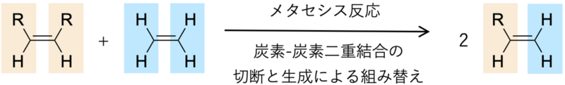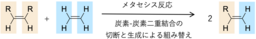炭素-炭素二重結合を、分子内あるいは分子間で組み替える反応。下図に示すように、炭素-炭素二重結合を持つ二種類の化合物から、新たな炭素-炭素二重結合を持つ化合物を生成することができる。ルテニウムやモリブデン等の金属錯体が触媒として利用される。