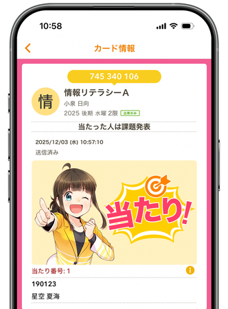 当たりくじ付き出席カードで、「当たり」を引いた画面