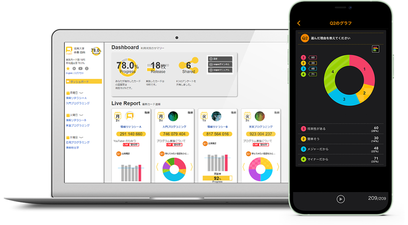 提出結果は即時に集計され、リアルタイムに表示します。 教員は学生の理解度や意見をその場で把握・フィードバックでき、双方向授業を促進します。 すべてのカードの提出記録から出席管理ができ、教員や職員が各学生の出席状況を確認できます。