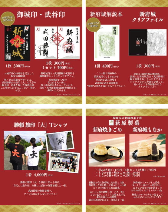 会場では、お城EXPO10周年を記念した限定デザインの新府城御城印をはじめ、武田勝頼の武将印、NEWグッズ、新府焼ごめなど、新府城にまつわるお土産品やオリジナルグッズを多数取り揃えます。