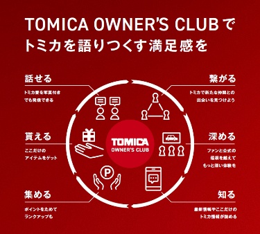 「トミカ」を愛する”トミカオーナー”の方々がオンライン上に集い、相互に交流を図る会員制コミュニティサイトです。メーカーとお客様の垣根を越え、ひとつのミニカーのオーナーとして愛着を持っていただきたいという想いから、「トミカ」初の公式ファンコミュニティを立ち上げます。ファン同士でお気に入りの「トミカ」を語り合ったり、開発の裏側を知れたり、ファンの方々と共創する公式コミュニ ティならではの企画など、”トミカオーナー”の心を躍らせる日常の中のエンジンとなるような場を目指します。また、リアルイベントとの連動も図ってまいります。