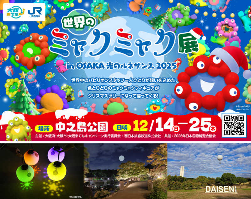 西日本旅客鉄道株式会社、公益社団法人2025年日本国際博覧会協会と協力し、大阪の冬を象徴するイベント「OSAKA光のルネサンス2025」の会場内において、大阪・関西万博会期中に大阪駅および大阪・関西万博会場内で好評を博した「世界のミャクミャク展」を実施します。さらに大阪市役所にて、大阪・関西万博の各国パビリオンで着用されたユニフォームの特別展示も実現します。心あたたまるイルミネーションの中で、大阪・関西万博の雰囲気を再び味わえる特別なひとときをお楽しみください。