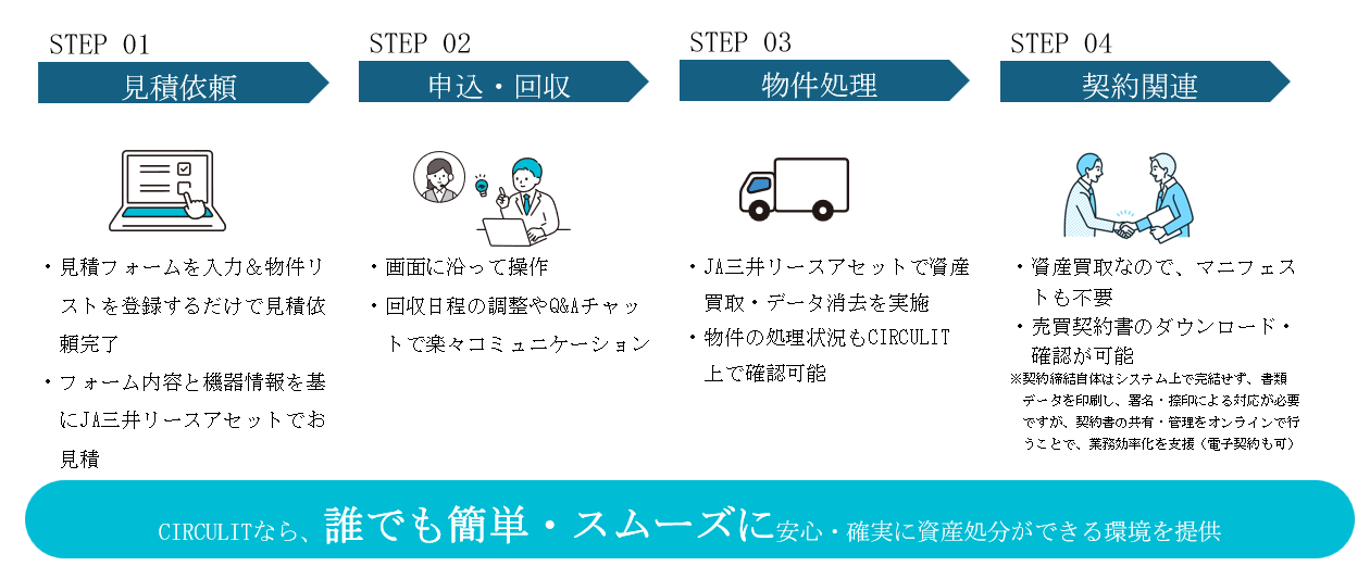 JA三井リース株式会社(本社:東京都中央区、代表取締役 社長執行役員:新分敬人、以下「JA三井リース」)の100%⼦会社であるJA三井リースアセット株式会社(本社:東京都中央区、代表取締役社長:高沼秀明、以下「JA三井リースアセット」)は、IT資産の処分業務を支援するクラウドサービス「CIRCULIT(サーキュリット)」を開始しましたので、下記の通りお知らせいたします。