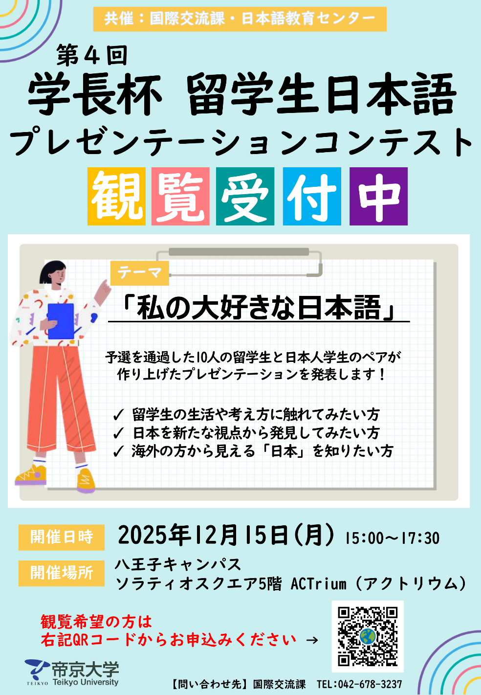 帝京大学は、「第4回学長杯 留学生日本語プレゼンテーションコンテスト」を開催します。