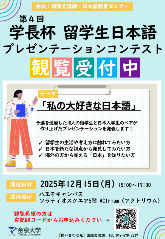 帝京大学が「第4回学長杯 留学生日本語プレゼンテーションコンテスト」を12/15 (月)に開催。