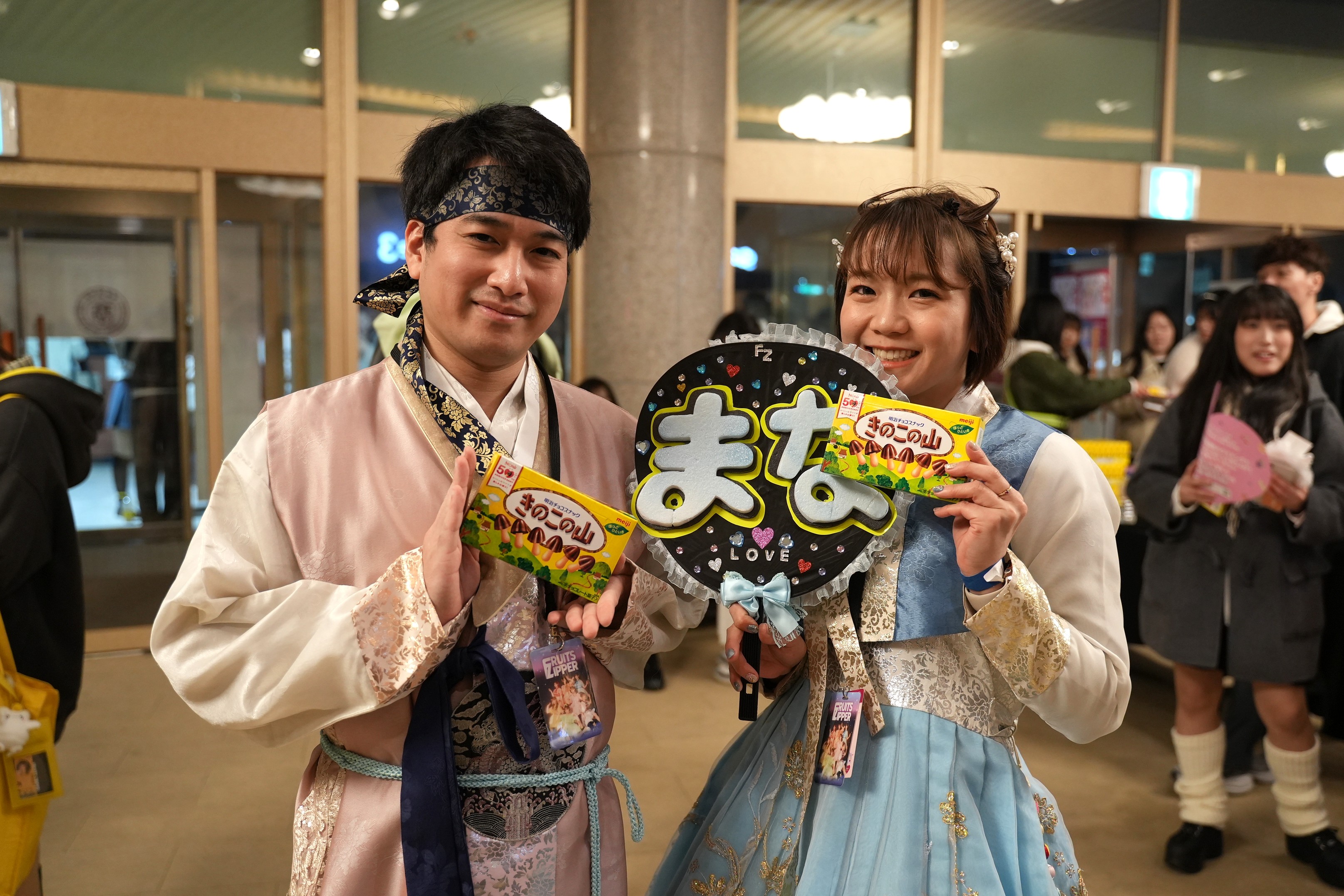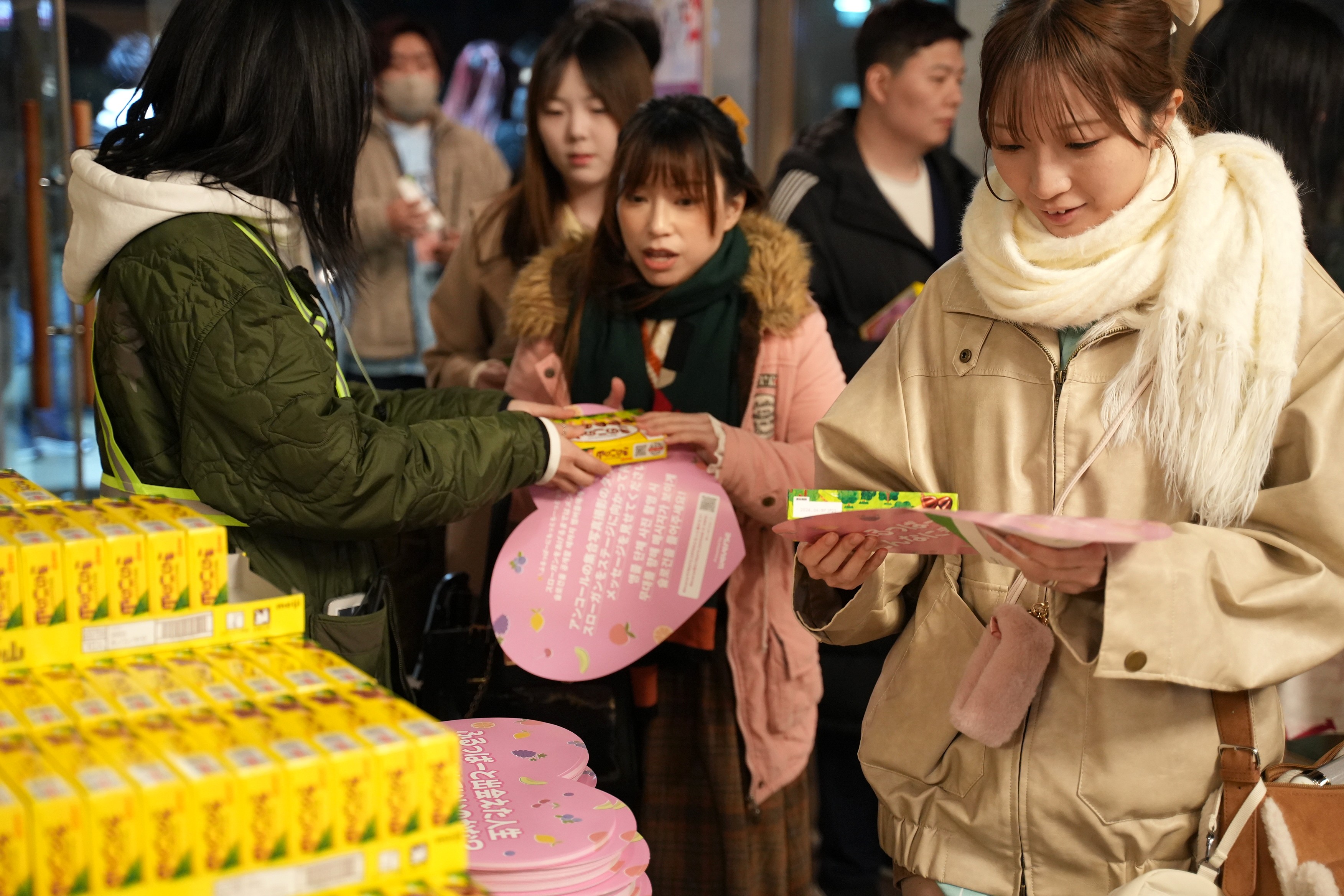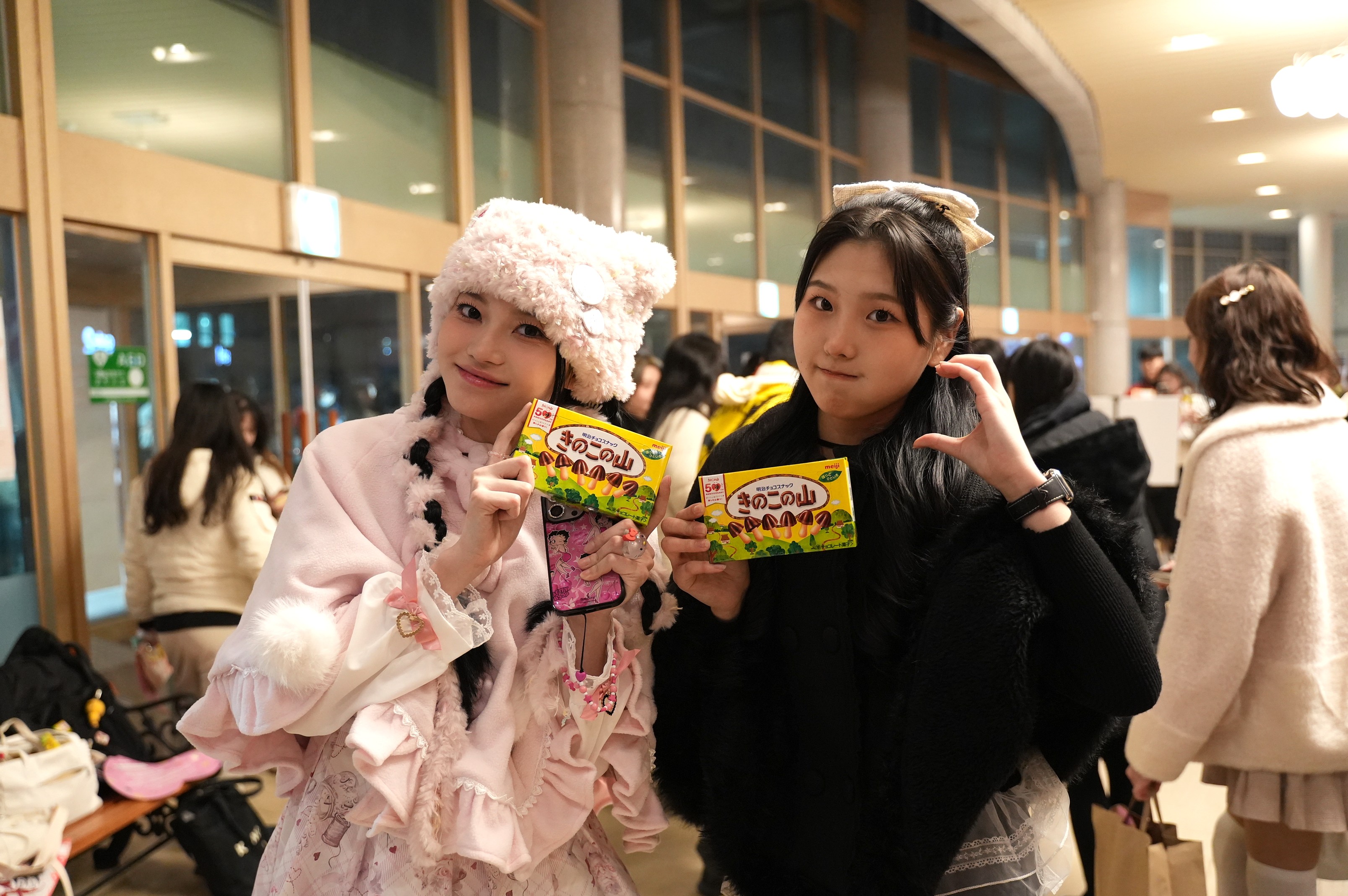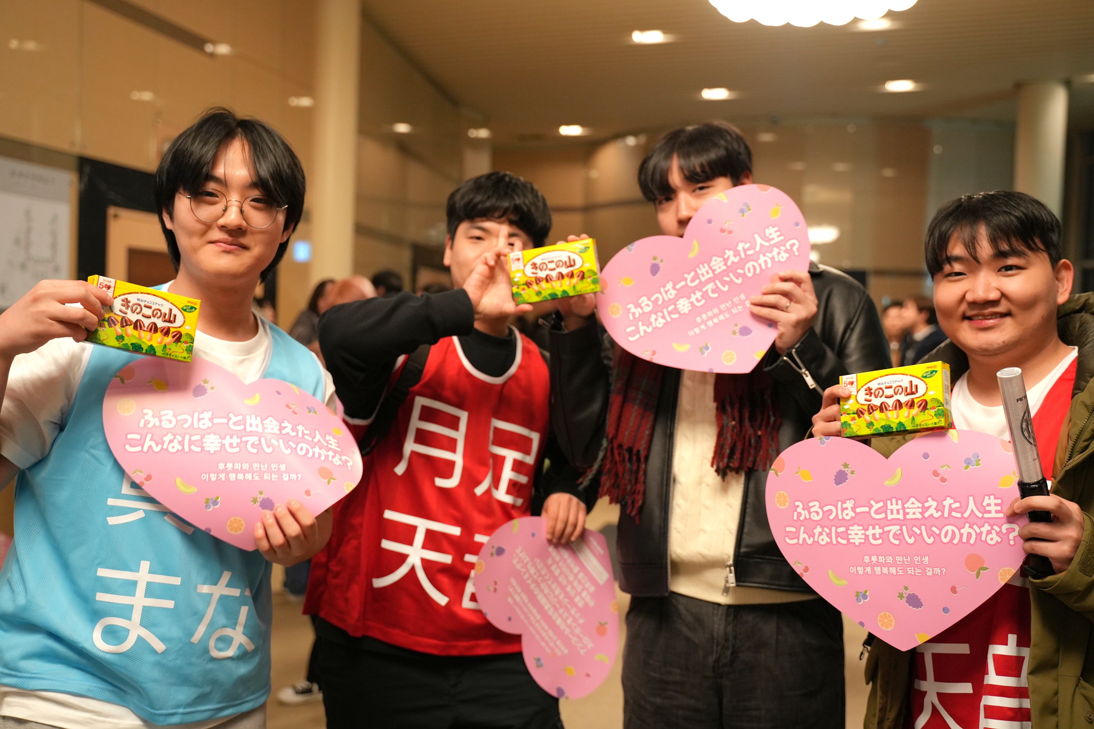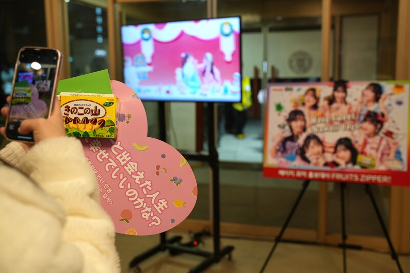 A lively atmosphere was on display as crowds of fans gathered and took photos with their gifts of Kinoko no Yama chocolate snacks in front of signage autographed by FRUITS ZIPPER members in Seoul.