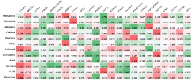 図1 様々なDNA修復因子の変異体が示す、各化学物質に対する感受性のプロファイルの一覧表。各変異細胞の化合物への感受性(また耐性)について、感受性指数を示す。負の値(赤)は感受性を、正の値(緑)は耐性を示す。絶対値が大きいほど、細胞影響が大きいことを意味する。