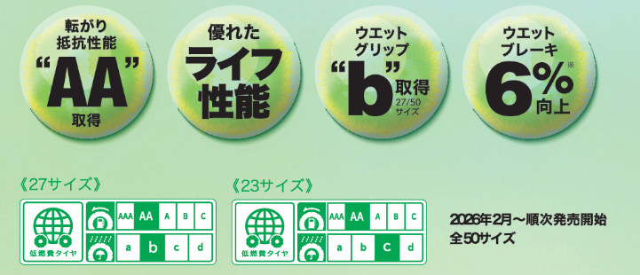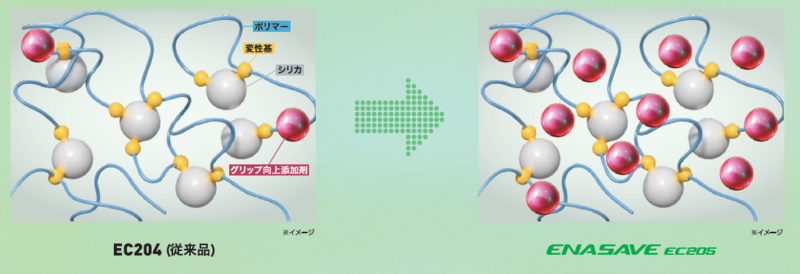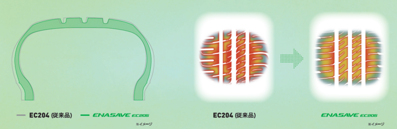 『ENASAVE EC205』は、低燃費性能とロングライフ性能を維持しながら、雨天時の安全性を高めるウエット性能を強化したタイヤです。従来品『ENASAVE EC204(エナセーブ イーシーニーマルヨン)』から低燃費性能および耐摩耗性能を維持しています。さらに、新開発ゴムの採用により全50サイズ中27サイズがウエットグリップ性能”b“を取得し、従来品『ENASAVE EC204』と比較してウエットブレーキ性能を約6%向上させています。全50サイズのラインアップで、コンパクトカーからセダンまで幅広い車種に対応します。