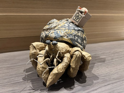 海の環境破壊が進む中、「親ヤドカリが子どもを大切に守る姿」をテーマにした作品。貝の部分に実際に使われていた段ボールを活かしている点が、胴体とのコントラストになっていて魅力的でした。造形力やユニークさも十分で、総合的にとても優れた作品だと感じました。
