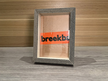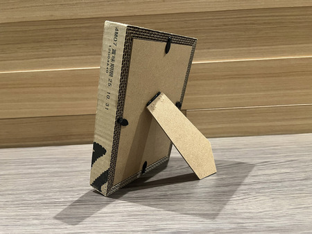 段ボールの断面をユニークに活かしてフレームにしている点が魅力的でした。テープも程よいアクセントになっており、端に見えるバーコードも味があって、とても良い雰囲気をつくり出していました。