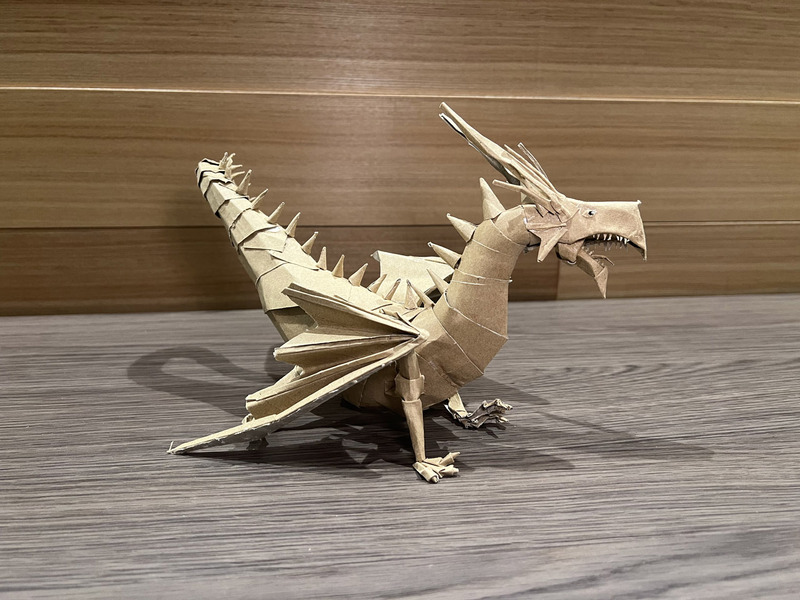 一見、段ボールに色をつけて表現しているように見えますが、実は段ボールが本来持つ色味を組み合わせて表現している点に工夫があり、とても面白かったです。造形も丁寧で完成度が高く、もし口がもう少し開いて実用性が加われば、さらに良くなると思いました。