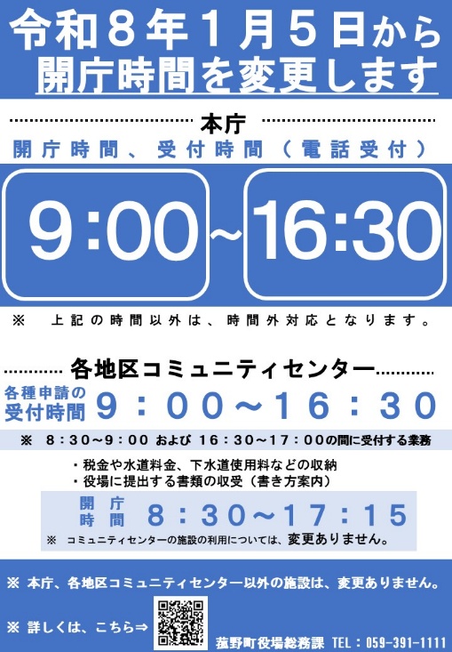 令和8年1月5日より、菰野町役場の開庁・受付時間を変更します