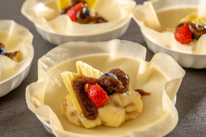 ホイップクリームとカスタードクリームを合わせ、砕いたカシューナッツを加えた特製クリームに、パイナップルと苺を添えました。黒酢風味のソースがアクセントの、中国風アレンジクレープです。