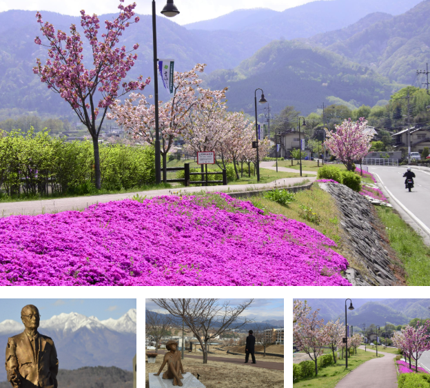 富士山や八ヶ岳、韮崎市の街並みが眺められる約1.8kmの散策道には、約100本の桜が植えてあり春になると芝桜と桜が咲くほか、四季折々の風景を楽しむことができます。