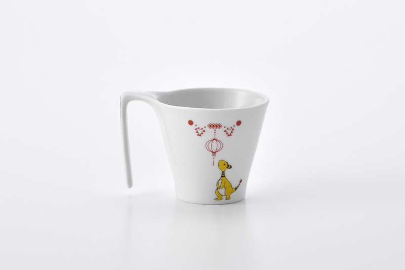 夜空に灯りをともすランタンを見上げるデンリュウを描いた波佐見焼のマグカップです。持ち手のデザインにはつながりをイメージした赤い七宝紋があしらわれています。