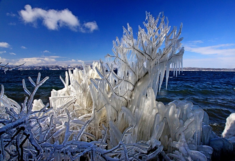 This phenomenon occurs when strong winter winds blow the lake water, freezing it onto trees along the shore, making it an extremely rare phenomenon in Japan.