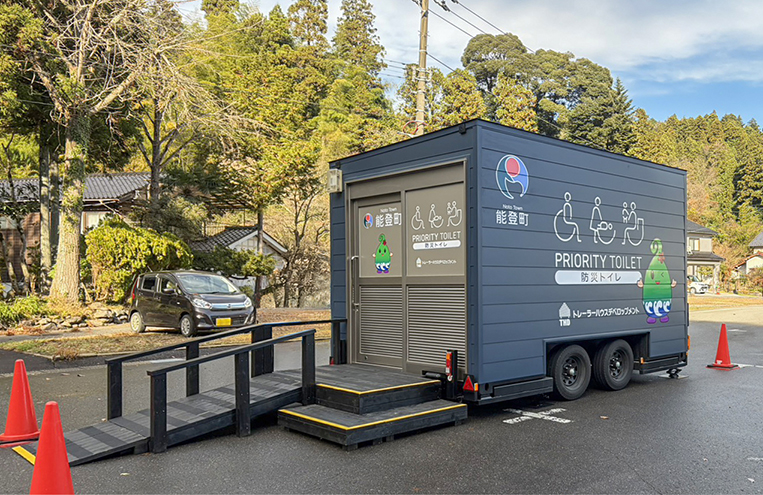 ナンバープレートが付いた自動車として扱われますので、正しく設置する事で建築確認申請が不要です。災害時には被災地の2次避難所へ移動させることで、車いす利用者を始めとする様々な人へ安心出来るトイレ環境を実現できます。