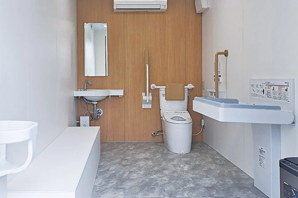 今回寄贈した製品「低床トイレトレーラー」は、専用シャーシを使用した上下水道と接続するバリアフリー構造の優先トイレです。車高を極限まで下げ、出来るだけ段差を少なくスムーズに昇降できるよう設計しました。室内に手すりやベビーシートを備え、どなたでも使いやすいトイレを目指しました。室内にはエアコンが完備され、年間を通して快適にトイレを利用できるのも魅力です。
