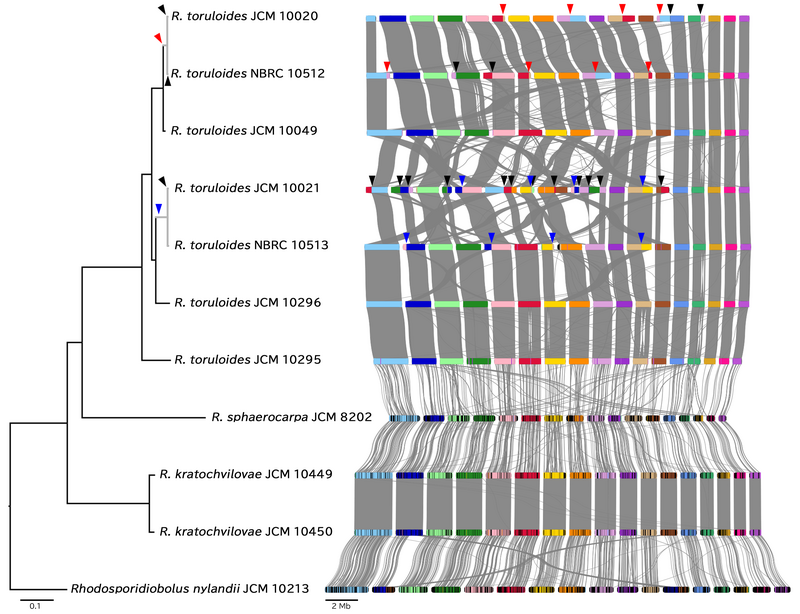 今回、東京農業大学総合研究所酵母多様性生物学・分類学研究室、理化学研究所バイオリソース研究センターを中心とした研究グループでは、この酵母のゲノム情報を整備するとともに種内の多様性を調査するため、R. toruloidesを中心としてリソースセンターに保存されている4種11株の酵母の全ゲノムを解読し、染色体全長レベルのゲノム情報を構築しました。その結果、この仲間の酵母の染色体構造は多くの菌株で概ね保存されている一方で、R. toruloidesの一部菌株において多数の染色体の転座が確認されました(図)。この染色体構造の違いは系統関係と照らし合わせると明らかに不自然であり、また同一の単離株由来の菌株間にも複数の転座が見られることから(図)、人為的な培養下で発生した、自然界では通常発生しない変化であると考えられます。これらの染色体構造変異の起こった菌株は外見的には目立った違いがなく、今回の染色体全長レベルのゲノム情報によって初めて判明した変異になります。