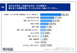 「Q2.あなたの平日(仕事がある日)の24時間で、最も多くの時間を使っているものを1つ選んでください。」(n=400)と質問したところ、「新技術・スキルの学習(資格勉強、セミナー参加など)」が26.3%、「仕事の持ち帰り作業」が17.5%という回答となりました。