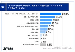 「Q3.あなたの休日の24時間で、最も多くの時間を使っているものを1つ選んでください。」(n=400)と質問したところ、「新技術・スキルの学習(資格勉強、セミナー参加など)」が23.3%、「副業・個人プロジェクト」が16.5%という回答となりました。