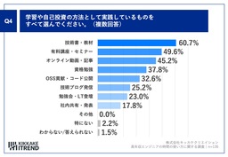 Q2またはQ3で「新技術・スキルの学習(資格勉強、セミナー参加など)」と回答した方に、「Q4.学習や自己投資の方法として実践しているものをすべて選んでください。(複数回答)」(n=135)と質問したところ、「技術書・教材」が60.7%、「有料講座・セミナー」が49.6%という回答となりました。