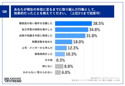 「Q8.あなたが現在の年収に至るまでに取り組んだ行動として、効果的だったことを教えてください。(上位3つまで回答可)」(n=400)と質問したところ、「難易度の高い案件を志願した」が38.5%、「自己学習の時間を増やした」が34.8%という回答となりました。