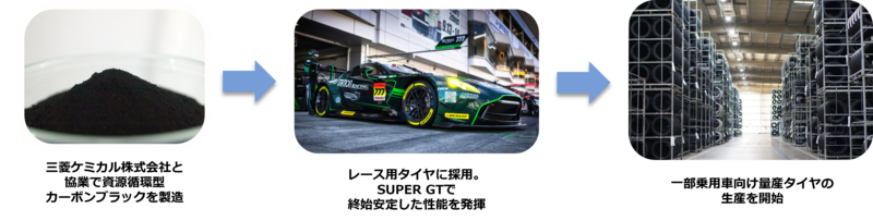 資源循環型カーボンブラックはタイヤ製造工程で発生するゴム片や使用済みタイヤをケミカルリサイクルすることで製造されるもので、2025年1月から三菱ケミカル株式会社と協業で取り組みを進めてきました。