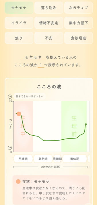 「こころの波」は、生理周期(約1カ月程度)の中で、ホルモンの変動によって生じ、自分ではコントロールしづらい精神的な症状の変化を“波”として表現したコンテンツです。アンケートにご協力いただいた10名の方の症状とエピソードを基に制作しており、生理・PMSにおける精神的症状によるつらさや期間にも個人差があることを示しています。