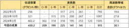 さらに、O帯での3モード伝送とE帯、S帯、C帯、L帯の単一モード伝送を組み合わせるため、カットオフシフト光ファイバを用いた広帯域WDM対応の単一モード・マルチモード統合光伝送システムを開発しました。図1に示すように、3モード伝送が可能なO帯に209波長、単一モード伝送のE帯、S帯、C帯、L帯に706波長を配置し、総周波数帯域幅30.1テラヘルツ(1,280.4 nm~1,608.9 nm)に及ぶ広帯域WDM光信号を生成しました。この光信号は、偏波多重のQPSK、16QAM、64QAM、256QAM方式を用いることで高いビットレートを実現しました。この光信号をカットオフシフト光ファイバで10 km伝送し、受信した光信号から理想的な誤り訂正符号の適用を仮定して推定したデータレート(一般化相互情報量(GMI:Generalized Mutual Information))は毎秒430.2テラビットに達し、国際標準準拠の光ファイバにおける伝送容量の世界記録を達成しました。また、一般的に使用される誤り訂正符号の場合のデータレートは、毎秒398.6テラビットとなりました。表1は、今回の成果と過去の単一モード伝送のみを用いた広帯域WDM伝送実験の比較を表しています。これらの結果は、マルチモード伝送技術によって、より少ない波長数・狭い周波数帯域で大容量伝送が可能であることを示しています。この伝送技術は、既存の光ファイバケーブルを増設することなく伝送容量を拡大できる経済的な手法となります。