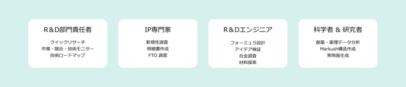 Patsnap Eurekaは、R&D部門責任者、知財担当、R&Dエンジニア、科学者・研究者など、研究開発・イノベーションに関わる幅広い専門家の日常業務を支援します。新規性調査、FTO調査、材料探索、フォーミュラ設計など、各職種の重要タスクをAIエージェントが迅速かつ高精度にサポートし、時間を最も価値ある業務へ振り向けられる環境を実現します。